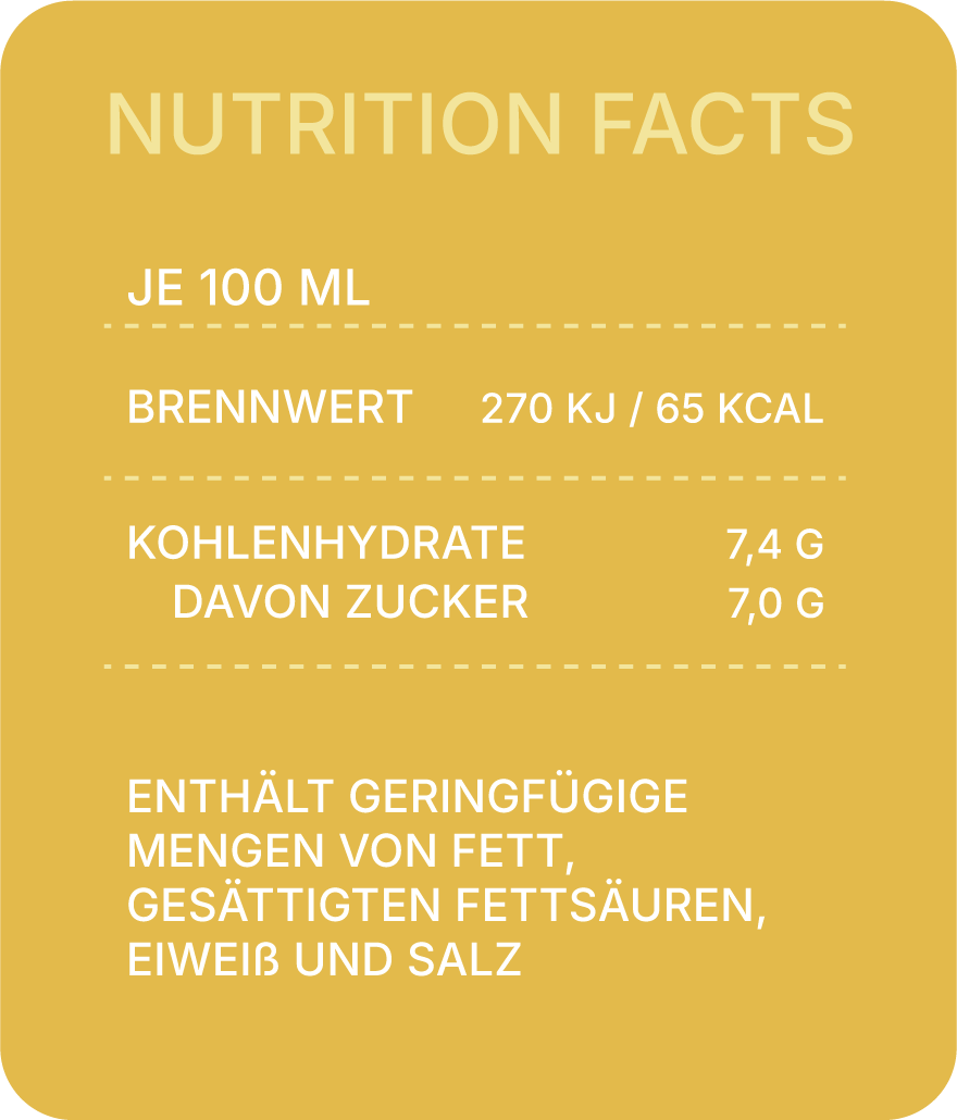 Zutaten: 51% Weißwein, Wasser, Saccharose, Kohlensäure, färbendes Konzentrat aus Karotte, natürliches Aroma, Säuerungsmittel: Citronensäure; Konservierungstoffe: Schwefeldioxid, Dimethyldicarbonat.